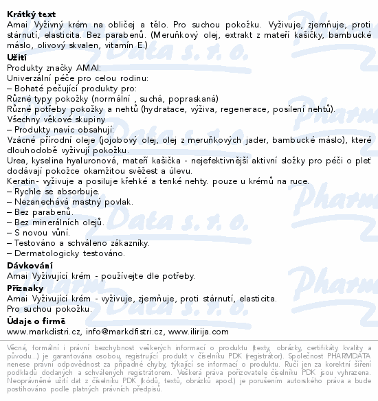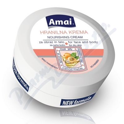 Amai Vyživný krém na obličej a tělo. Pro suchou pokožku. Vyživuje, zjemňuje, proti stárnutí, elasticita. Bez parabenů. (Meruňkový olej, extrakt z mateří kašičky, bambucké máslo, olivový skvalen, vitamín E.)