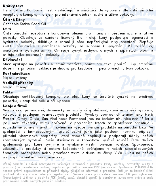 Herb Extract Konopná mast - zvláčňující a ošetřující. Je vyrobena dle čistě přírodní receptury s konopným olejem pro intenzivní ošetření suché a citlivé pokožky.