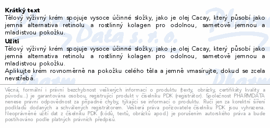 Tělový výživný krém spojuje vysoce účinné složky, jako je olej Cacay, který působí jako jemná alternativa retinolu a rostlinný kolagen pro odolnou, sametově jemnou a mladistvou pokožku.