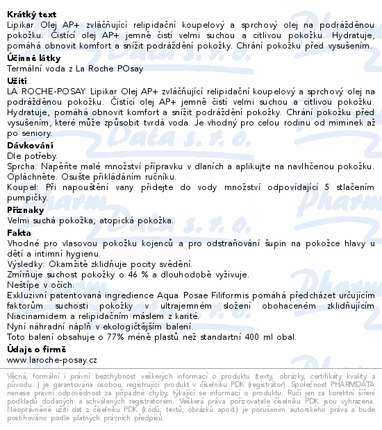 Lipikar Olej AP+ zvláčňující relipidační koupelový a sprchový olej na podrážděnou pokožku. Čistící olej AP+ jemně čistí velmi suchou a citlivou pokožku. Hydratuje, pomáhá obnovit komfort a snížit podráždění pokožky. Chrání pokožku před vysušením.