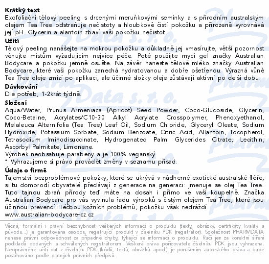 Exofoliační tělový peeling s drcenými meruňkovými semínky a s přírodním australským olejem Tea Tree odstraňuje nečistoty a hloubkově čistí pokožku a přirozeně vyrovnává její pH. Glycerin a alantoin zbaví vaši pokožku nečistot.