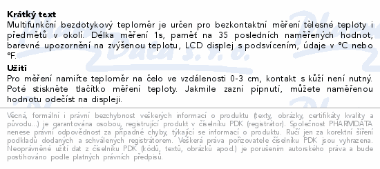Multifunkční bezdotykový teploměr je určen pro bezkontaktní měření tělesné teploty i předmětů v okolí. Délka měření 1s, paměť na 35 posledních naměřených hodnot, barevné upozornění na zvýšenou teplotu, LCD displej s podsvícením, údaje v °C nebo °F.
