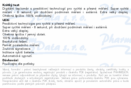 Digitální teploměr s prediktivní technologií pro rychlé a přesné měření. Super rychlé měření - 8 sekund, při dodržení podmínek měření i axilárně. Extra velký displej. Ohebná špička. 100% voděodolný.