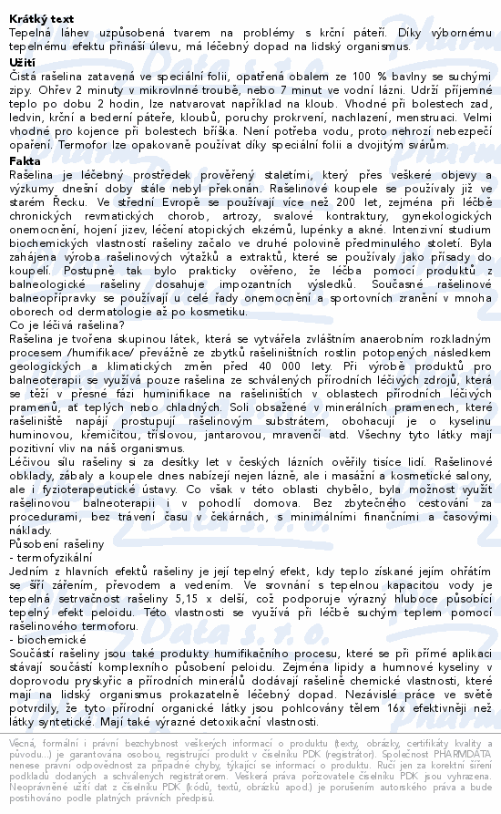 Použití – termofor se ohřívá obvykle v mikrovlnné troubě, horkovzdušné a elektrické troubě nebo ve vodní lázni. Po nahřátí se přiloží na oblast krku. Díky vysoké tepelné kapacitě rašeliny zůstává příjemně teplý po desítky minut.