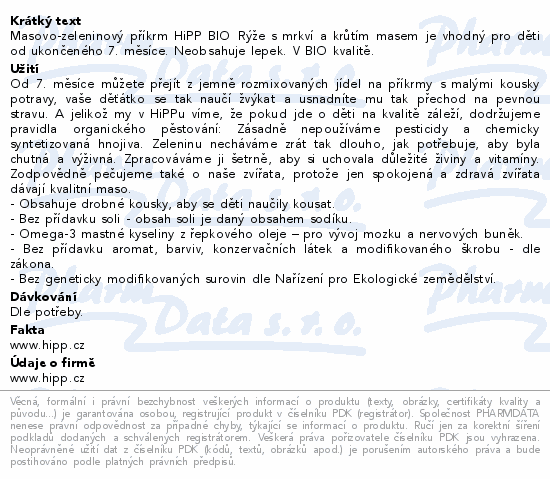 Masovo-zeleninový příkrm HiPP BIO Rýže s mrkví a krůtím masem je vhodný pro děti od ukončeného 7. měsíce. Neobsahuje lepek. V BIO kvalitě.