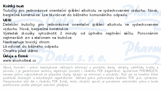 Trubičky pro jednorázové orientační zjištění alkoholu ve vydechovaném vzduchu. Nová, bezpečná konstrukce. Lze likvidovat do běžného komunálního odpadu.