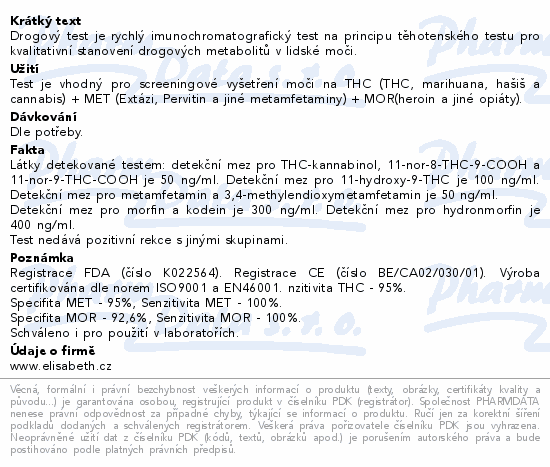Drogový test je rychlý imunochromatografický test na principu těhotenského testu pro kvalitativní stanovení drogových metabolitů v lidské moči.