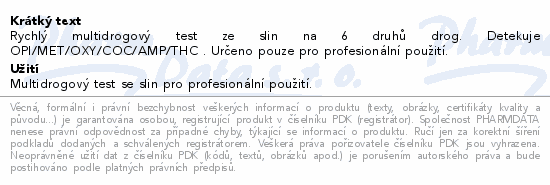 Rychlý multidrogový test ze slin na 6 druhů drog. Detekuje OPI/MET/OXY/COC/AMP/THC . Určeno pouze pro profesionální použití.