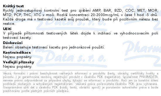 Rychlý jednostupňový kontrolní test pro zjištění AMP, BAR, BZD, COC, MET, MOR, MTD, PCP, THC, XTC v moči. Rozliší koncentraci 20-2000mcg/mL v čase 1 hod -5 dnů. Každá droga má v testovací kazetě svůj proužek, který bude při pozitivním nálezu bez reakce.