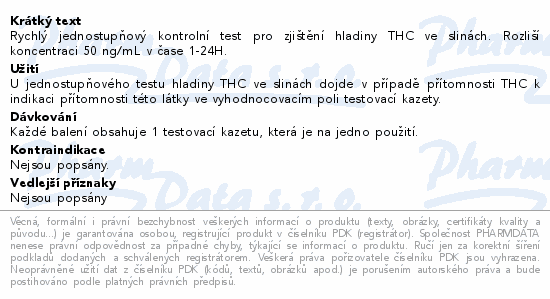Rychlý jednostupňový kontrolní test pro zjištění hladiny THC ve slinách. Rozliší koncentraci 50 ng/mL v čase 1-24H.