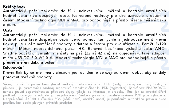 Automatický pažní tlakoměr slouží k neinvazivnímu měření a kontrole arteriálních hodnot tlaku krve dospělých osob. Naměřené hodnoty pro dva uživatelé s datem a časem. Moderní technologie MDI a MAC pro pohodlnější a přesto přesné měření tlaku a pulsu.