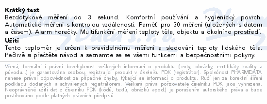 Bezdotykové měření do 3 sekund. Komfortní používání a hygienický povrch. Automatické měření s kontrolou vzdálenosti. Paměť pro 30 měření (uložených s datem a časem). Alarm horečky. Multifunkční měření teploty těla, objektu a okolního prostředí.