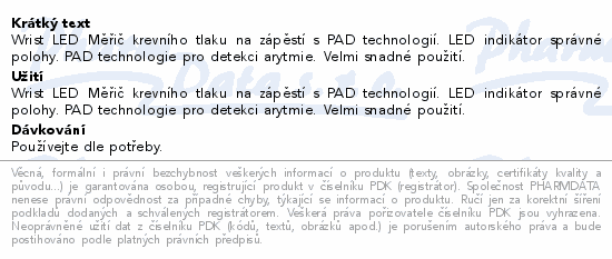 Wrist LED Měřič krevního tlaku na zápěstí s PAD technologií. LED indikátor správné polohy. PAD technologie pro detekci arytmie. Velmi snadné použití.