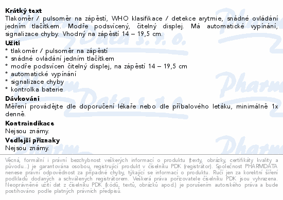 Tlakoměr / pulsoměr na zápěstí, WHO klasifikace / detekce arytmie, snádné ovládání jedním tlačítkem. Modře podsvícený, čitelný displej. Má automatické vypínání, signalizace chyby. Vhodný na zápěstí 14 – 19,5 cm.