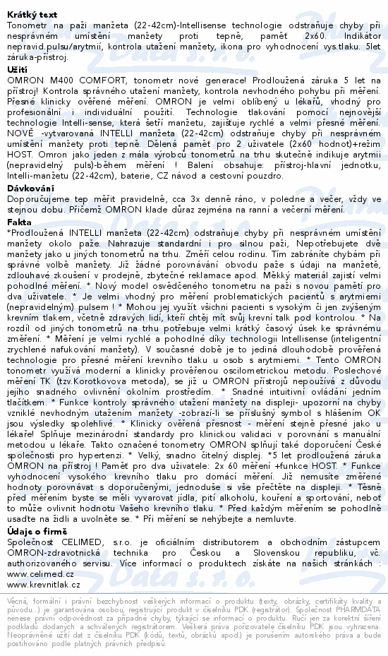 Tonometr na paži manžeta (22-42cm)-Intellisense technologie odstraňuje chyby při nesprávném umístění manžety proti tepně, paměť 2x60. Indikátor nepravid.pulsu/arytmií, kontrola utažení manžety, ikona pro vyhodnocení vys.tlaku.4roky záruka-přístroj.