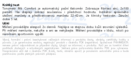Tonometr M6 Comfort je automatický pažní tlakoměr. Má novou funkci zobrazení fibrilace síní, má 2x100 pamětí. Na displeji zobrazí současnou i předchozí hodnotu. Má indikátor správné utažení manžety a předtvarovanou manžetu 22-42cm. Je klinicky testován.