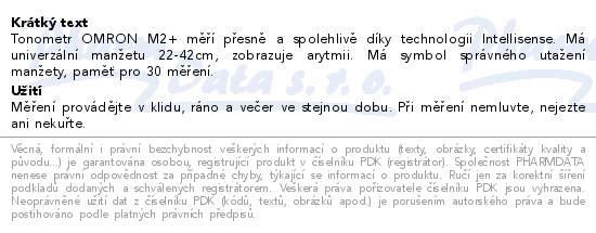 Tonometr OMRON M2+ měří přesně a spolehlivě díky technologii Intellisense. Má univerzální manžetu 22-42cm, zobrazuje arytmii. Má symbol správného utažení manžety, paměť pro 30 měření.