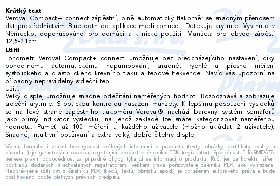 Veroval Compact+ connect zápěstní, plně automatický tlakoměr se snadným přenosem dat prostřednictvím Bluetooth do aplikace medi.connect. Detekuje arytmie. Vyvinuto v Německo, doporučováno pro domácí a klinické použití. Manžeta pro obvod zápěstí 12,5-21cm