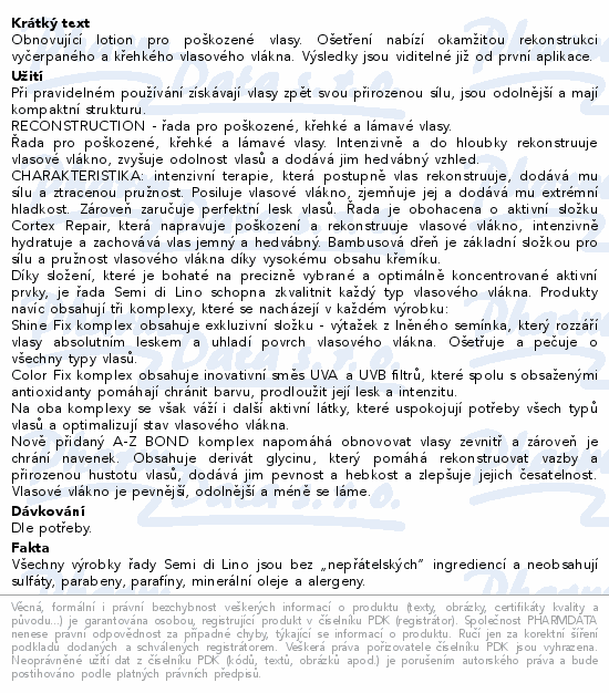 Obnovující lotion pro poškozené vlasy. Ošetření nabízí okamžitou rekonstrukci vyčerpaného a křehkého vlasového vlákna. Výsledky jsou viditelné již od první aplikace.
