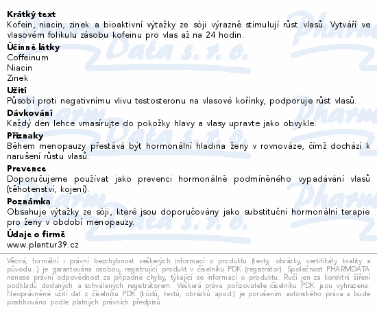 Kofein, niacin, zinek a bioaktivní výtažky ze sóji výrazně stimulují růst vlasů. Vytváří ve vlasovém folikulu zásobu kofeinu pro vlas až na 24 hodin.