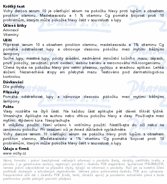Vichy dercos serum 10 je ošetřující sérum na pokožku hlavy proti lupům s obsahem pirokton olaminu, Madekasosidu a 1 % vitaminu Cg pomáhá bojovat proti 10 problémům, kterým může pokožka hlavy čelit v souvislosti s lupy.