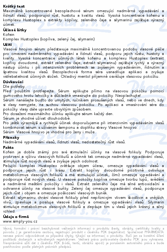 Maximálně koncentrované bezoplachové sérum omezující nadměrné vypadávání a řídnutí vlasů, podporující růst, hustotu a kvalitu vlasů. Vysoká koncentrace kofeinu a komplexu Hustoplex s extrakty kopřivy, zeleného čaje a silymarinu zajišťuje výrazný účinek.