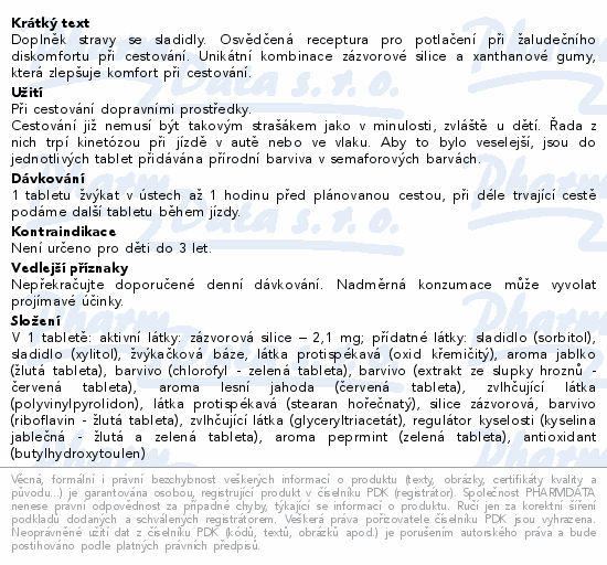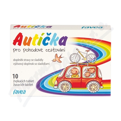 Autíčka pro pohodové cestování je doplněk stravy ve formě žvýkacích tablet. Přípravek obsahuje zázvorovou silici, která potlačuje nevolnost při cestování. Žvýkačky jsou určeny dětem před jízdou dopravními prostředky. Jsou ve třech semaforových barvách s různým aroma – jablko, lesní jahoda, peprmint. Dávkování - 1 žvýkací tableta ½ až 1 hodinu před plánovanou cestou. Při déle trvající cestě možno podat další tabletu během jízdy.