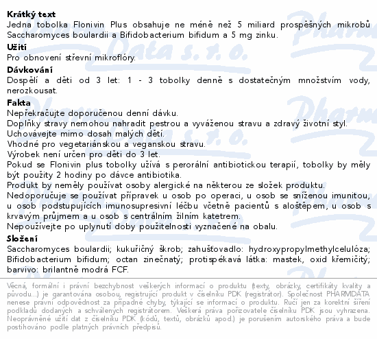 Jedna tobolka Flonivin Plus obsahuje ne méně než 5 miliard prospěšných mikrobů Saccharomyces boulardii a Bifidobacterium bifidum a 5 mg zinku.
