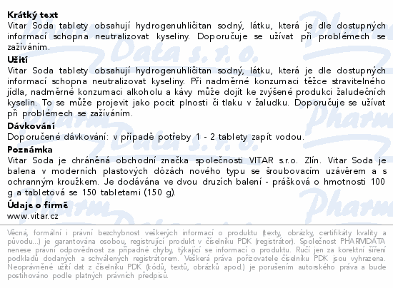 Vitar Soda tablety obsahují hydrogenuhličitan sodný, látku, která je dle dostupných informací schopna neutralizovat kyseliny. Doporučuje se užívat při problémech se zažíváním.