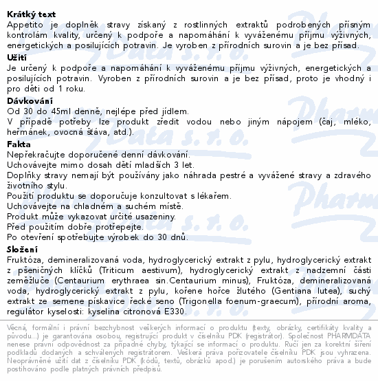 Appetito je doplněk stravy získaný z rostlinných extraktů podrobených přísným kontrolám kvality, určený k podpoře a napomáhání k vyváženému příjmu výživných, energetických a posilujících potravin. Je vyroben z přírodních surovin a je bez přísad.