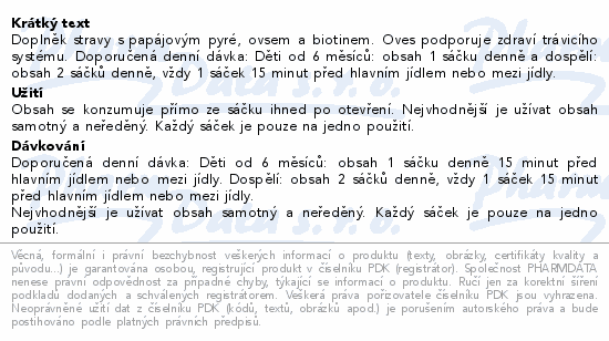 Doplněk stravy s papájovým pyré, ovsem a biotinem. Oves podporuje zdraví trávicího systému. Doporučená denní dávka: Děti od 6 měsíců: obsah 1 sáčku denně a dospělí: obsah 2 sáčků denně, vždy 1 sáček 15 minut před hlavním jídlem nebo mezi jídly.
