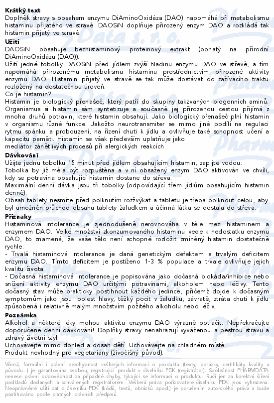 Doplněk stravy s obsahem enzymu DiAminoOxidáza (DAO) napomáhá při metabolismu histaminu přijatého ve stravě. DAOSiN doplňuje přirozený enzym DAO a rozkládá tak histamin přijatý ve stravě.
