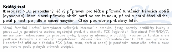 Iberogast NEO je rostlinný léčivý přípravek pro léčbu příznaků funkčních trávicích obtíží (dyspepsie). Mezi hlavní příznaky obtíží patří bolest žaludku, pálení v horní části břicha, pocit plnosti po jídle a časné nasycení. Čtěte pozorně příbalový leták.