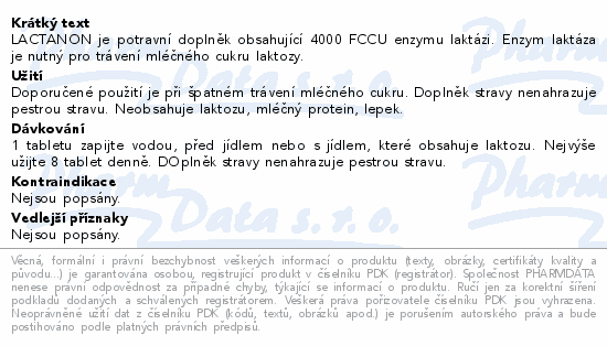 LACTANON je potravní doplněk obsahující 4000 FCCU enzymu laktázi. Enzym laktáza je nutný pro trávení mléčného cukru laktozy.