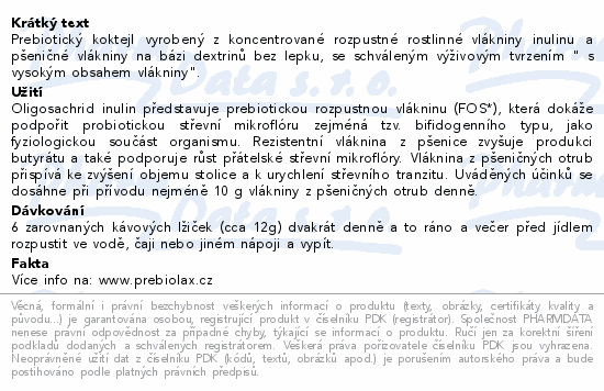 Prebiotický koktejl vyrobený z koncentrované rozpustné rostlinné vlákniny inulinu a pšeničné vlákniny na bázi dextrinů bez lepku, se schváleným výživovým tvrzením " s vysokým obsahem vlákniny".