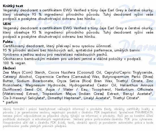 Veganský deodorant s certifikátem EWG Verified s tóny čaje Earl Grey a čerstvé okurky, který obsahuje 95 % ingrediencí přírodního původu. Tuhý deodorant vyživí vaše podpaží a poskytne dlouhotrvající ochranu bez hliníku.