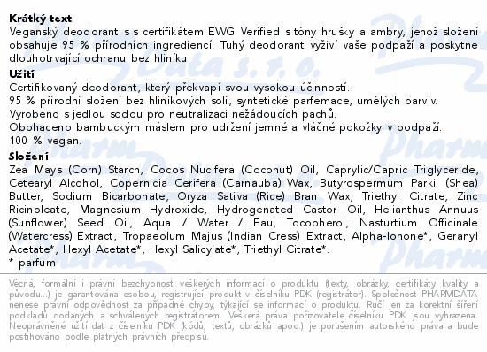 Veganský deodorant s s certifikátem EWG Verified s tóny hrušky a ambry, jehož složení obsahuje 95 % přírodních ingrediencí. Tuhý deodorant vyživí vaše podpaží a poskytne dlouhotrvající ochranu bez hliníku.