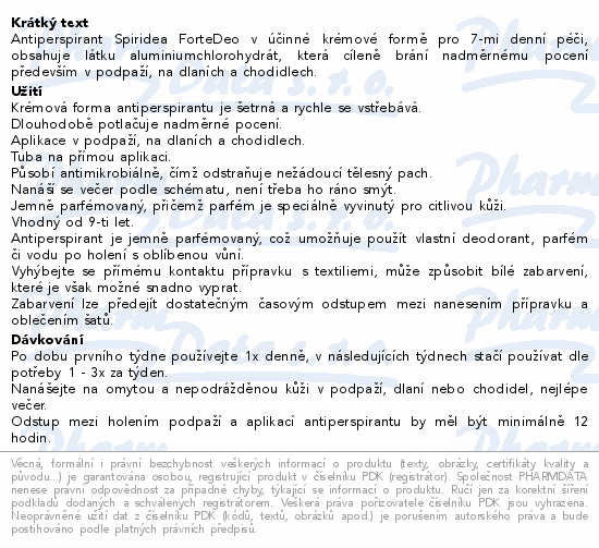 Antiperspirant Spiridea ForteDeo v účinné krémové formě pro 7-mi denní péči, obsahuje látku aluminiumchlorohydrát, která cíleně brání nadměrnému pocení především v podpaží, na dlaních a chodidlech.
