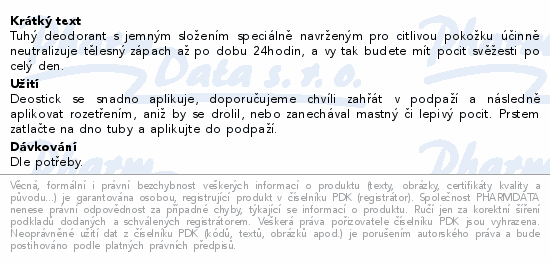 Tuhý deodorant s jemným složením speciálně navrženým pro citlivou pokožku účinně neutralizuje tělesný zápach až po dobu 24hodin, a vy tak budete mít pocit svěžesti po celý den.