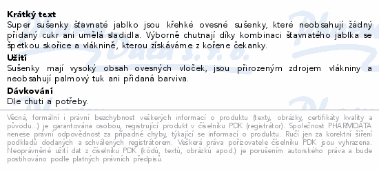 Super sušenky šťavnaté jablko jsou křehké ovesné sušenky, které neobsahují žádný přidaný cukr ani umělá sladidla. Výborně chutnají díky kombinaci šťavnatého jablka se špetkou skořice a vláknině, kterou získáváme z kořene čekanky.