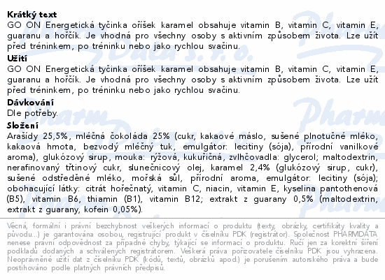 GO ON Energetická tyčinka oříšek karamel obsahuje vitamin B, vitamin C, vitamin E, guaranu a hořčík. Je vhodná pro všechny osoby s aktivním způsobem života. Lze užít před tréninkem, po tréninku nebo jako rychlou svačinu.