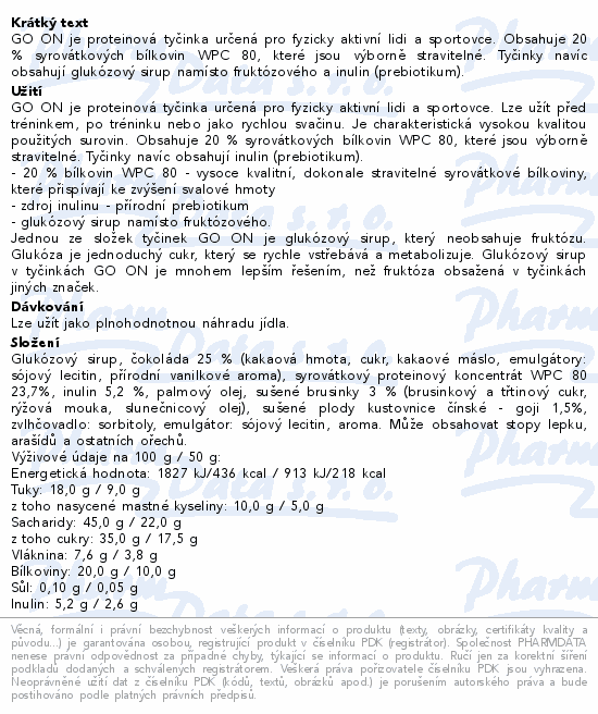 GO ON je proteinová tyčinka určená pro fyzicky aktivní lidi a sportovce. Obsahuje 20 % syrovátkových bílkovin WPC 80, které jsou výborně stravitelné. Tyčinky navíc obsahují glukózový sirup namísto fruktózového a inulin (prebiotikum).