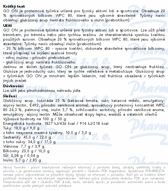 GO ON je proteinová tyčinka určená pro fyzicky aktivní lidi a sportovce. Obsahuje 20 % syrovátkových bílkovin WPC 80, které jsou výborně stravitelné. Tyčinky navíc obsahují glukózový sirup namísto fruktózového a inulin (prebiotikum).