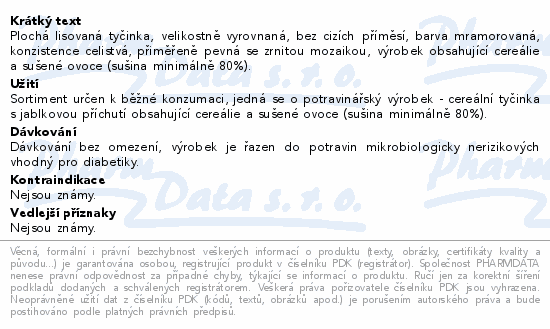 Plochá lisovaná tyčinka, velikostně vyrovnaná, bez cizích příměsí, barva mramorovaná, konzistence celistvá, přiměřeně pevná se zrnitou mozaikou, výrobek obsahující cereálie a sušené ovoce (sušina minimálně 80%).