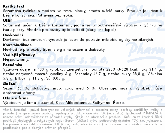 Sezamová tyčinka s medem ve tvaru placky, hmota světlé barvy. Produkt je určen k běžné konzumaci. Potravina bez lepku.