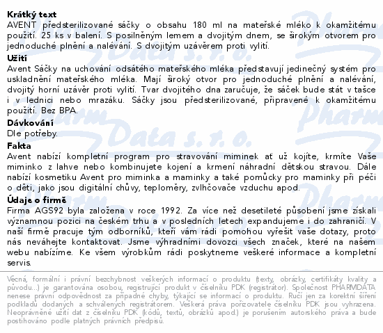 AVENT předsterilizované sáčky o obsahu 180 ml na mateřské mléko k okamžitému použití. 25 ks v balení. S posilněným lemem a dvojitým dnem, se širokým otvorem pro jednoduché plnění a nalévání. S dvojitým uzávěrem proti vylití.