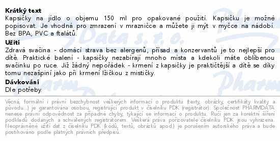 Kapsičky na jídlo o objemu 150 ml pro opakované použití. Kapsičku je možné popisovat. Je vhodná pro zmrazení v mrazničce a můžete ji mýt v myčce na nádobí. Bez BPA, PVC a ftalátů.