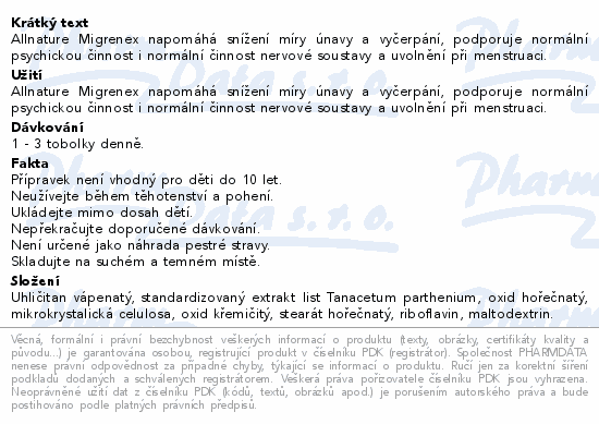 Allnature Migrenex napomáhá snížení míry únavy a vyčerpání, podporuje normální psychickou činnost i normální činnost nervové soustavy a uvolnění při menstruaci.