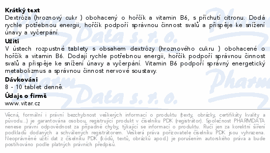 Dextróza (hroznový cukr ) obohacený o hořčík a vitamin B6, s příchutí citronu. Dodá rychle potřebnou energii, hořčík podpoří správnou činnost svalů a přispěje ke snížení únavy a vyčerpání.