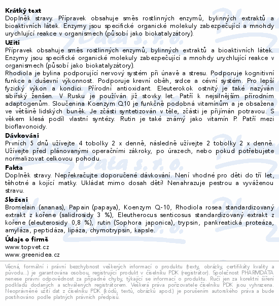Doplněk stravy. Přípravek obsahuje směs rostlinných enzymů, bylinných extraktů a bioaktivních látek. Enzymy jsou specifické organické molekuly zabezpečující a mnohdy urychlující reakce v organismech (působí jako biokatalyzátory).